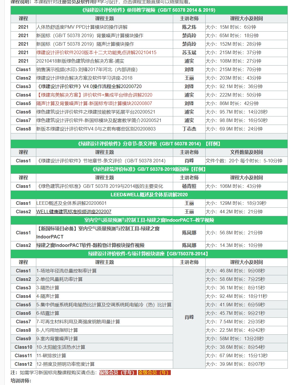 课程安排:按照专项计算、软件使用、分章节和新国标免费、leed和well、indoorpact软件介绍使用等进行设计分类;
