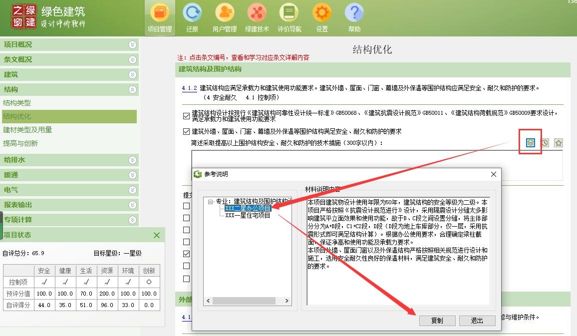 4.1.2建筑结构应满足承载力和建筑使用功能要求。其中需要简述采取提高围护结构安全、耐久和防护的技术措施。我们可以点击“参考说明”,直视最为标准和专业的话术,加以修改即可形成本院自己的新模板。