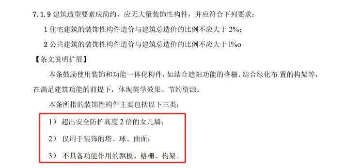 7.1.9 建筑造型要素应简约,应无大量装饰性构件,并应符合下列要求: