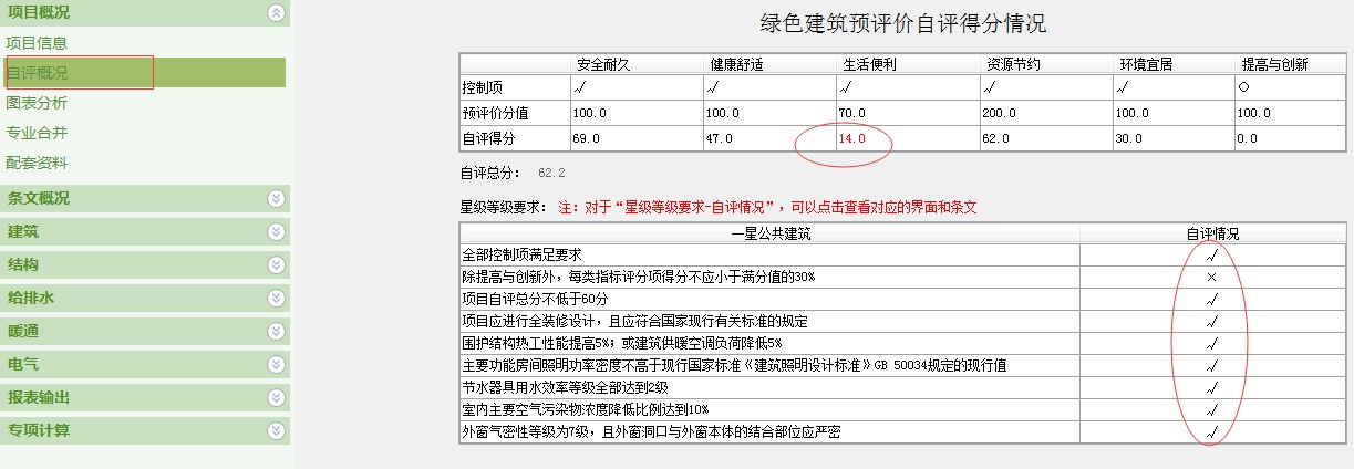 第二种,从项目概况里面的“自评概况”看也能看到那个章节不满足,不光这个还能提示你达到这个星级,地方标准强条哪些是必须满足的。