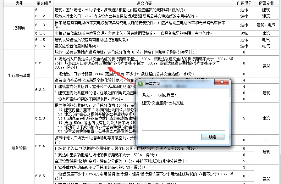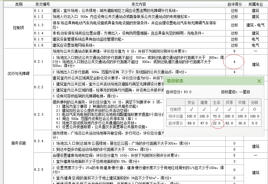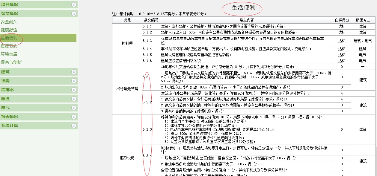 知道章节不满足总要解决的,不然出了报告也不满足。这个时候您说了不满足找厂家,找大表哥解决啊,人闲事非多大表哥真心表示无奈。接下来就给您分析分析,知道章节不满足了就到“项目概况”里去找,记得是项目概况;找到“生活便利”这个章节查看得分项,控制项不用看了是达标显示。看6.2.注意这个“2”,这一列都是得分项,从易到难看看哪些得分我们没有拿到。