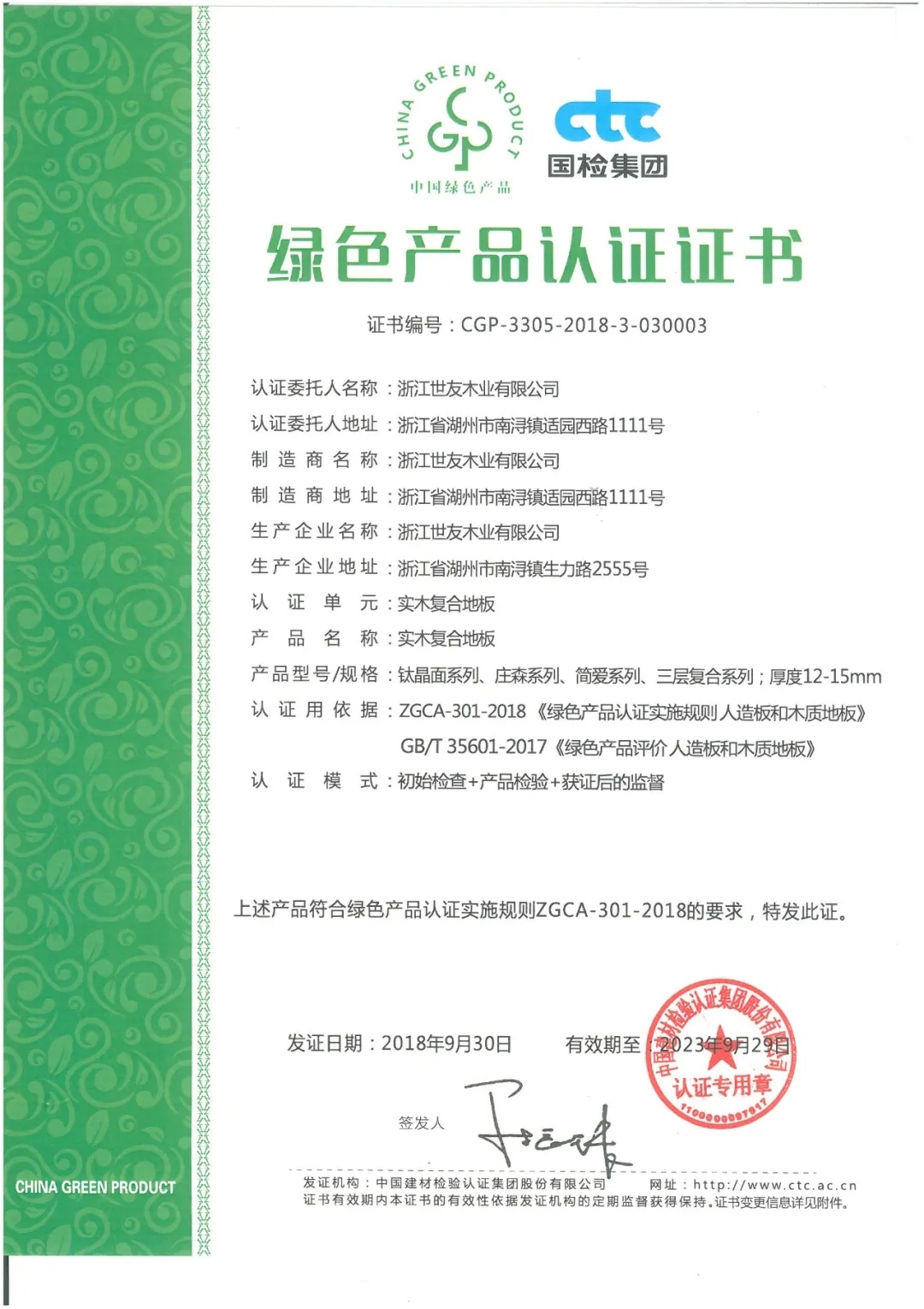 1) 认证委托人/制造商/生产厂的名称、地址;2) 认证单元名称,及产品名称、系列、规格型号等;3) 认证依据;4) 认证模式;5) 发证日期和有效期;6) 认证机构名称;7) 证书编号;8) 其他依法需要标注的内容。以ctc湖州试点颁发的绿色产品认证证书为例: